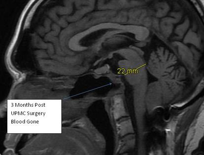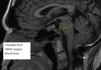 MRI 3 months post surgery - Blood resolved. Brain stem relaxed and expanded forward by almost 4 mm which might as well be a football field (in places) in the brain for those who are not familiar with brain anatomy.