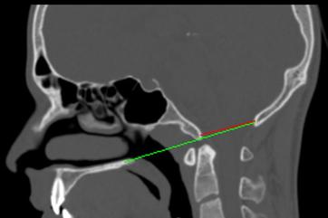 The top of the odontoid is normally at the level of a line drawn from from the hard palate (roof of your mouth) to the base of the occiput.
