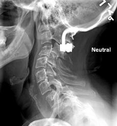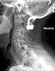Plain film of C-spn 15 years post decompression of foramen magnum, placement of a bovine (cow) pericardium sling for ACM, and titanium rod fusion of occiput to C3 (C4 ?) - PRE odontoid removal.