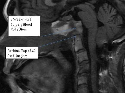 Physicians at UPMC in Pittsburgh developed new technique around 2010. Using a small endoscope, through the nose, then a small catheter through the back of the nasopharynx ( nose/mouth ) they removed ( via tiny drill ) most of C1 and C2. Quite risky being that close to brain stem. No small complications, sort of an all or nothing thing. This is me 2 weeks post surgery.