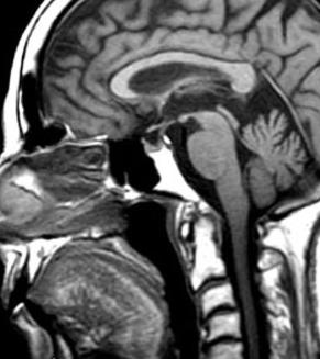 MRI normal brain - At 6 o'clock on the image, round topped vertical white bone (dens-C2) is below a large white almost triangular pointy bone (clivus). Brain stem (grey oval) is behind strip of black (spinal fluid - CSF). Brain stem controls everything that keeps you alive.