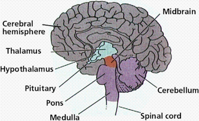 The medulla oblongata is the lower half of the brainstem, which is continuous with the spinal chord, the upper-half being the pons. It is often referred to simply as the medulla. The medulla contains the cardiac, respitory, vomitting, and vasomotor. Centers and so deals with the autonomic (involuntary) funtions of breathing, heartrate, and blood pressure. The medulla oblongata connects the higher levels of the brain to the spinal chord and is responsible for several functions of the autonomous nervous system, which include :